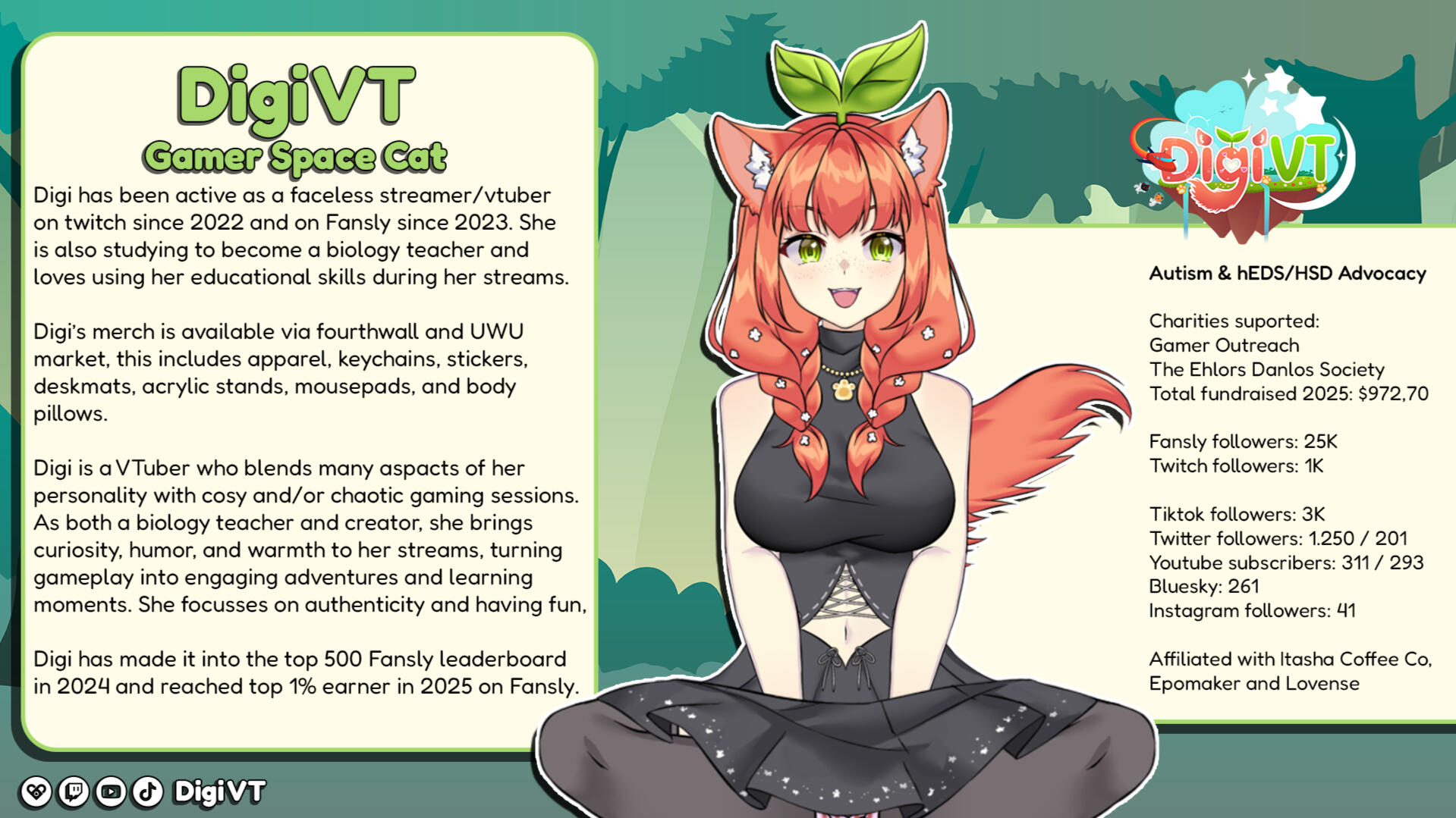 I am Digi and I stream on Twitch and Fansly. You can take a look around this site for all the inportant information about me, my content and where you can find everything!Interested in working together? You can find my press kit here and reach out via the envelope icon below.